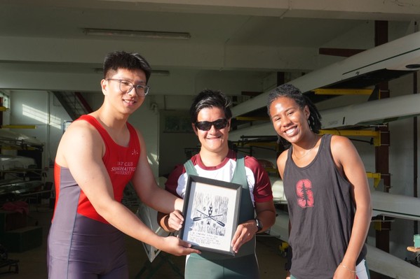 图8、图9:大道书院本科生桨手刘楷鑫创作“亦可赛艇”木工印刷画,全队签名后赠予JCBC。