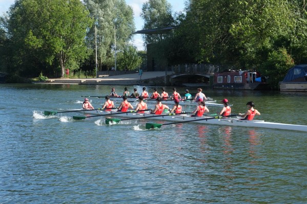 图4:泰晤士河上,上科大赛艇队(前)与由两校各4名桨手及1名舵手组成的中英联队(后)正在进行友谊追逐赛,最终上科大队略胜一筹