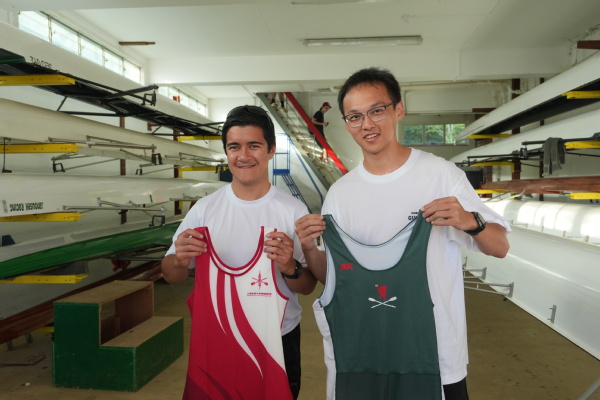 图10:信息学院研究生桨手胡瑀(右)与JCBC主席Columbus Layton(左)互换队服留念